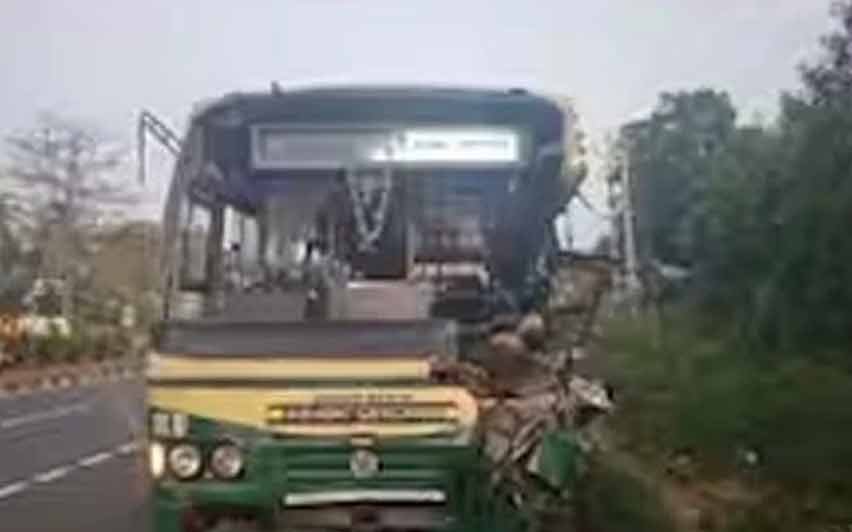 ദേശീയപാതയില് നിന്നും കൊടകര സെന്ററിലേക്ക് ഇറങ്ങുകയായിരുന്നു ബസ്. ബസിന്റെ മുൻഭാഗം ആദ്യം ഒരു ലോറിയില് തട്ടി. പിന്നില് മറ്റൊരു ലോറിയും വന്ന് ഇടിച്ചു.