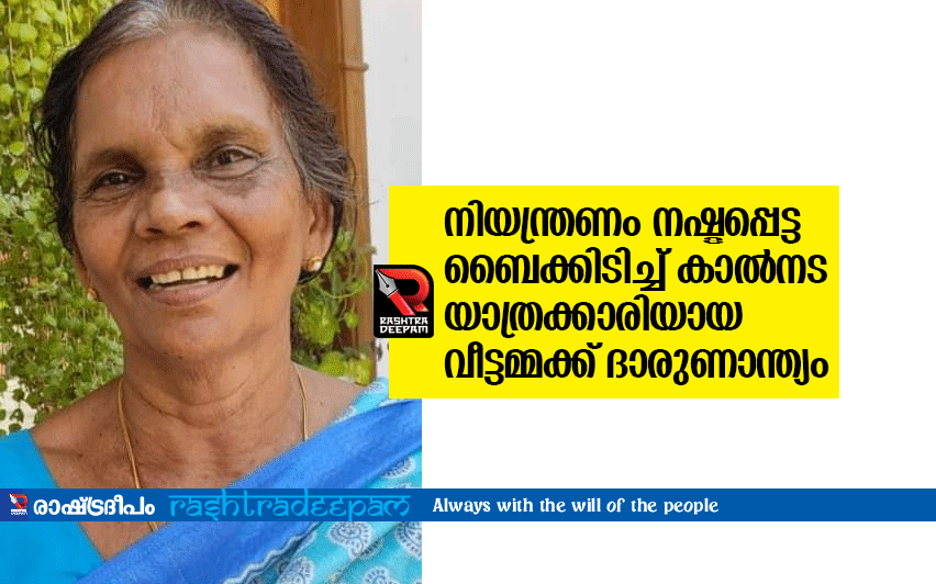 പേഴയ്ക്കാപ്പിള്ളി സ്വദേശികളായ രണ്ടംഗ സംഘം സഞ്ചരിച്ച ബൈക്കാണ് അപകടത്തില്പെട്ടത്. സുമതിയുടെ മൃതദേഹം മൂവാറ്റുപുഴ ജനറല് ആശുപത്രിയില് പോസ്റ്റ്മോര്ട്ടം നടത്തിയ ശേഷം ബന്ധുക്കള്ക്ക് വിട്ട് നല്കും. സംസ്കാരം ശനിയാഴ്ച രാവിലെ 11.30ന് മൂവാറ്റുപുഴ നഗരസഭ ശ്മശാനത്തില്. ഭര്ത്താവ് പരേതനായ രാമകൃഷ്ണന്. മക്കള്: ബിനിത, ബബിത, ബിനു. മരുമക്കള്: ഉദയകുമാര്, ദിനേഷ് കുമാര്, സരിത.
