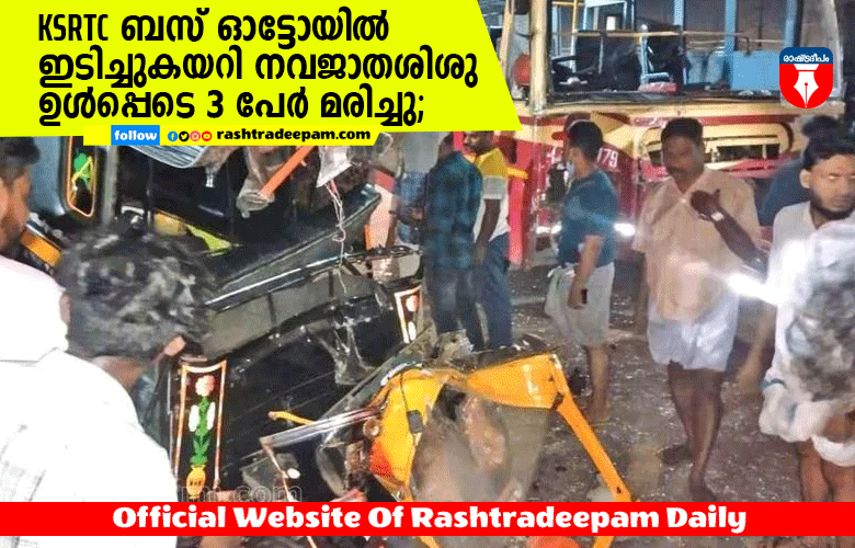 തിരുവനന്തപുരം: പ്രസവശേഷം ആശുപത്രിയില് നിന്ന് വീട്ടിലേക്ക് മടങ്ങുകയായിരുന്ന കുടുംബം സഞ്ചരിച്ച ഓട്ടോറിക്ഷയില് കെ.എസ്.ആര്.ടി.സി. ഫാസ്റ്റ് പാസഞ്ചര് ഇടിച്ച് നവജാതശിശു അടക്കം മൂന്നുപേര് മരിച്ചു. മണമ്പൂര് സ്വദേശി മഹേഷിന്റെയും അനുവിന്റെയും നാല് ദിവസം പ്രായമായ പെണ്കുഞ്ഞ്, അനുവിന്റെ അമ്മ ശോഭ (41), ഓട്ടോ ഡ്രൈവര് സുനില് (34) എന്നിവരാണ് മരിച്ചത്.