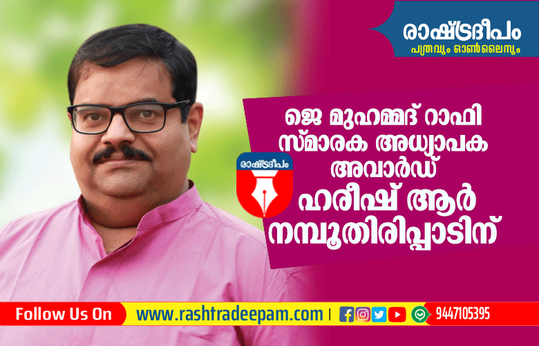 തിരുവനന്തപുരം: സംസ്ഥാന മദ്യവര്ജ്ജന സമിതിയുടെ ജെ മുഹമ്മദ് റാഫി സ്മാരക അധ്യാപക അവാര്ഡ് ഹരീഷ് ആര് നമ്പൂതിരിപ്പാടിന് .2022 ഏപ്രില് 23 ശനിയാഴ്ച വൈകുന്നേരം 5 മണിക്ക് തിരുവനന്തപുരം ഗാന്ധിഭവനില് സംഘടിപ്പിക്കുന്ന ചടങ്ങില് എറണാകുളം ജില്ലയില് മൂവാറ്റുപുഴ വിദ്യാഭ്യാസ ജില്ലയിലെ രാമമംഗലം ഹൈസ്കൂള് അധ്യാപകനായ ഹരീഷ് ആര് നമ്പൂതിരിപ്പാടിന് മുന് എംപി പന്ന്യന് രവീന്ദ്രന് പുരസ്കാരം നല്കും .അധ്യാപകനും ബാലസാഹിത്യകാരനുമായ ഹരീഷ് ആര് നമ്പൂതിരിപ്പാട് ബാലസാഹിത്യ, പുരാണ വൈജ്ഞാനിക മേഖലകളില് 46 പുസ്തകങ്ങള് രചിച്ചിട്ടുണ്ട്. രണ്ട് വര്ഷക്കാലമായി ഗുണപാഠകഥകള് രചിച്ച് ശബ്ദം നല്കി വാട്സാപ്പ് വഴി കുട്ടികളില് എത്തിക്കുന്നു.