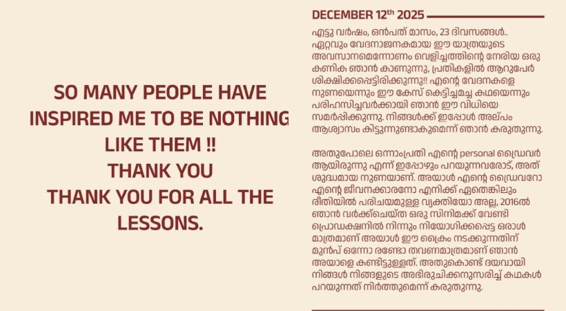 അതുപോലെ ഒന്നാംപ്രതി എന്റെ personal ഡ്രൈവർ ആയിരുന്നു എന്ന് ഇപ്പോഴും പറയുന്നവരോട്, അത് ശുദ്ധമായ നുണയാണ്. അയാൾ എന്റെ ഡ്രൈവറോ എന്റെ ജീവനക്കാരനോ എനിക്ക് ഏതെങ്കിലും രീതിയിൽ പരിചയമുള്ള വ്യക്തിയോ അല്ല, 2016ൽ ഞാൻ വർക്ക്ചെയ്ത ഒരു സിനിമക്ക് വേണ്ടി പ്രൊഡക്ഷനിൽ നിന്നും നിയോഗിക്കപ്പെട്ട ഒരാൾ മാത്രമാണ് അയാൾ ഈ ക്രൈം നടക്കുന്നതിന് മുൻപ് ഒന്നോ രണ്ടോ തവണമാത്രമാണ് ഞാൻ അയാളെ കണ്ടിട്ടുള്ളത്. അതുകൊണ്ട് ദയവായി നിങ്ങൾ നിങ്ങളുടെ അഭിരുചിക്കനുസരിച്ച് കഥകൾ പറയുന്നത് നിർത്തുമെന്ന് കരുതുന്നു.ഈ വിധി പലരെയും ഒരുപക്ഷേ നിരാശപ്പെടുത്തിയിരിക്കാം എന്നാൽ എനിക്കിതിൽ അത്ഭുതമില്ല. 2020 ന്റെ അവസാനം തന്നെ ചില അന്യായമായ നീക്കങ്ങൾ എനിക്ക് ബോധ്യപ്പെട്ടിരുന്നു. കുറ്റാരോപിതരിൽ ഒരാളുടെ കാര്യത്തിലേക്ക് അടുക്കുമ്പോൾ മാത്രം കേസ് അതുവരെ കൈകാര്യം ചെയ്തുവെന്ന രീതിയിൽ നിന്നും മാറ്റം സംഭവിക്കുന്നു എന്നത് പ്രോസിക്യൂഷനും മനസ്സിലായിരുന്നു.