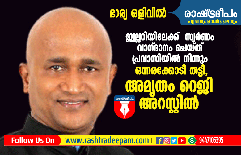 ബഹ്റൈൻ പ്രവാസിയായ സുഭാഷ് എന്ന ബിസിനസ്സുകാരന് ജ്വല്ലറി നടത്താനാവശ്യമായ സ്വർണം നൽകാമെന്ന് പറഞ്ഞു അഡ്വാൻസായി ഒന്നര കോടി രൂപ വാങ്ങിയിട്ട് ഉത്ഘാടനദിനം സ്വർണം നൽകാതെ പറ്റിച്ച കേസിലാണ് അമൃതം ഗ്രൂപ്പ് ഓഫ് കമ്പനീസ് എംഡി റെജി ജോസഫ് എന്ന അമൃതം റെജി പിടിയിലായി. മലപ്പുറം ജില്ലയിലെ പോത്തുകല്ലില് പുതുതായി തുടങ്ങിയ ജ്വല്ലറിയിലേക്ക് സ്വര്ണ്ണാഭരണങ്ങള് എത്തിക്കാമെന്ന് വാഗ്ദാനം ചെയ്ത് ഒന്നര കോടി രൂപയിലേറെ തട്ടിയെടുത്ത കേസിലാണ് കോയമ്പത്തൂരില് സ്ഥിരതാമസക്കാരനായ മലയാളി അമൃതം റെജിയെ പോത്തുകല് പൊലീസ് സ്റ്റേഷന് ഓഫീസര് ശംഭു നാഥിന്റെ നേതൃത്വത്തിലുള്ള സംഘം തൃശ്ശൂരില് നിന്ന് പിടികൂടിയത്.