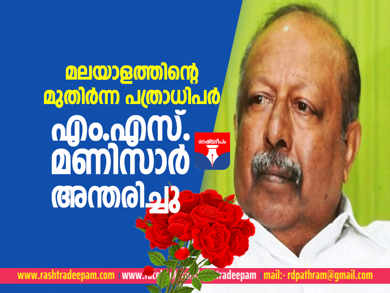 മലയാളത്തിന്റെ മുതിര്ന്ന പത്രാധിപര് കലാകൗമുദി ചീഫ് എഡിറ്ററും കൗമുദി സ്ഥാപകനുമായ എം.എസ് മണി (79) അന്തരിച്ചു. മണിസാറിന്റെ നിര്യാണത്തില് രാഷ്ട്രദീപം ഗ്രൂപ്പിന്റെ ആദരാഞ്ജലികള്
