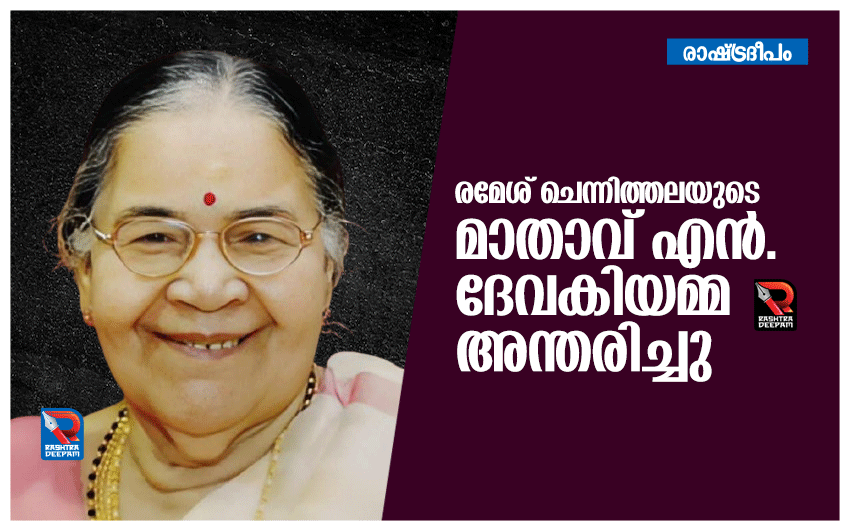തിരുവനന്തപുരം: മുന് പ്രതിപക്ഷ നേതാവും കോണ്ഗ്രസ് വര്ക്കിങ് കമ്മിറ്റി അംഗവുമായ രമേശ് ചെന്നിത്തലയുടെ മാതാവ് എന്. ദേവകിയമ്മ (91) അന്തരിച്ചു. ചെന്നിത്തല തൃപ്പരുന്തുറ കോട്ടൂര് കിഴക്കേതില് പരേതനായ വി. രാമകൃഷ്ണന് നായരുടെ (ചെന്നിത്തല മഹാത്മാ ഹൈസ്കൂള് മുന് മാനേജര്, അധ്യാപകന്) ഭാര്യയും മുന് ചെന്നിത്തല പഞ്ചായത്തംഗവുമായിരുന്നു.
