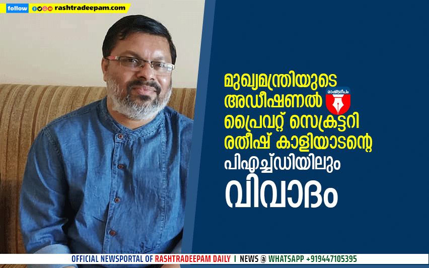 തിരുവനന്തപുരം: മുഖ്യമന്ത്രിയുടെ അഡീഷണല് പ്രൈവറ്റ് സെക്രട്ടറിയും അക്കാദമിക് അഡൈ്വസറുമായ രതീഷ് കാളിയാടന്റെ പിഎച്ച്ഡിയിലും വിവാദമുയര്ന്നു. അനധികൃതമായാണ് രതീഷ് പിഎച്ച്ഡി നേടിയതെന്നാണ് കണ്ടെത്തല്. ഹയര്സെക്കന്ഡറി അദ്ധ്യാപകനായി ജോലി ചെയ്ത കാലയളവില് അസം സര്വകലാശാലയില് നിന്നും ഫുള്ടൈം പിഎച്ച്ഡി നേടിയതെന്നാണ് രേഖയിലുള്ളത്.