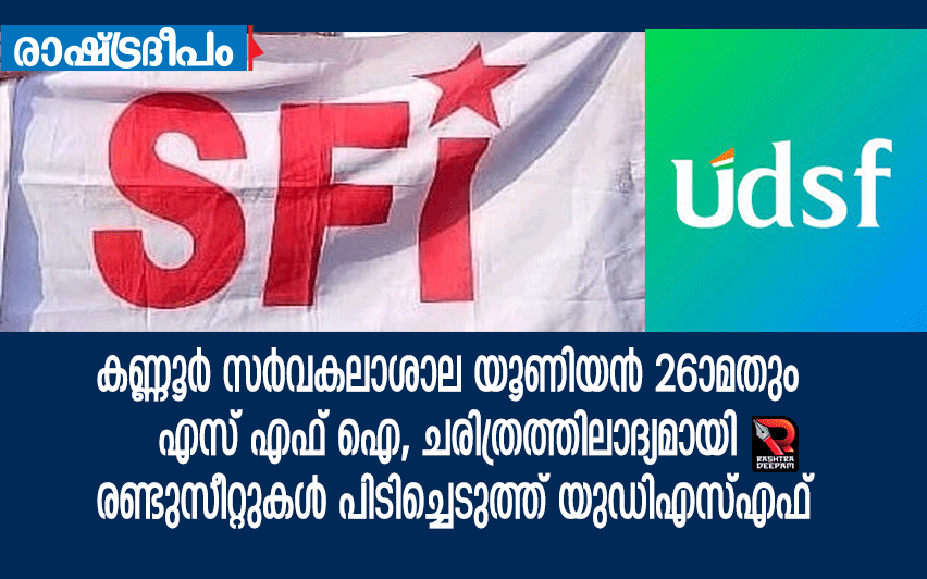 കണ്ണൂര്: കണ്ണൂര് സര്വകലാശാല യൂണിയന് 26ാമതും എസ്എഫ്ഐ നിലനിര്ത്തി. അഞ്ച് ജനറല് സീറ്റുകളടക്കം ആറുസീറ്റുകള് എസ്എഫ്ഐ നേടി. ചരിത്രത്തിലാദ്യമായി രണ്ടുസീറ്റുകള് എംഎസ്എഫ്-കെ.എസ്.യു സഖ്യമായ യുഡിഎസ്എഫ് എസ്എഫ്ഐയില്നിന്ന് പിടിച്ചെടുത്തു. കാസര്കോട്, വയനാട് ജില്ലാ എക്സിക്യൂട്ടിവ് സീറ്റുകളാണ് യുഡിഎസ്എഫ് പിടിച്ചെടുത്തത്.