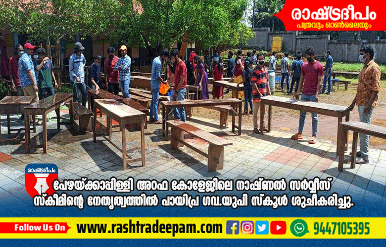 മൂവാറ്റുപുഴ: പേഴയ്ക്കാപ്പിള്ളി അറഫ കോളേജിലെ നാഷ്ണല് സര്വ്വീസ് സ്കീമിന്റെ നേതൃത്വത്തില് സ്കൂള് തുറക്കുന്നതിന് മുന്നോടിയായി പായിപ്ര ഗവ.യുപി സ്കൂള് സ്കൂളും പരിസരവും ശുചീകരിച്ചു. പഞ്ചായത്ത് പ്രസിഡന്റ് മാത്യൂസ് വര്ക്കി ശുചീകരണ പ്രവര്ത്തനങ്ങള് ഉദ്ഘാടനം ചെയ്തു. കോളേജ് മാനേജര് നസീര് അലിയാര് അധ്യക്ഷനായിരുന്നു.