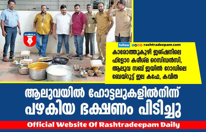ആലുവ : ആലുവ നഗരസഭാ ആരോഗ്യവിഭാഗം നടത്തിയ പരിശോധനയില് മൂന്ന് ഹോട്ടലുകളില്നിന്ന് പഴകിയ ഭക്ഷണം പിടിച്ചു. കാരോത്തുകുഴി ജങ്ഷനിലെ ഫ്ളോറ കരീശ്മ റെസിഡന്സി, ആലുവ സബ് ജയില് റോഡിലെ ബേയ്റൂട്ട് ഇല കഫേ, സബ് ജയില് റോഡിലെ കവിത എന്നിവിടങ്ങളില് നിന്നാണ് പഴകിയ ഭക്ഷണം പിടിച്ചത്.