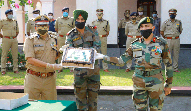 കോവിഡ് പ്രതിരോധത്തിന്റെ മുന്നിരയില് പ്രവര്ത്തിച്ച പോലീസ് ഉദ്യോഗസ്ഥര്ക്ക് ഇന്ത്യന് സൈന്യത്തിന്റെ ആദരം. തിരുവനന്തപുരത്ത് പോലീസ് ആസ്ഥാനത്തെ ധീരസ്മൃതിഭൂമിയില് നടന്ന ചടങ്ങില് പാങ്ങോട് മിലിറ്ററി സ്റ്റേഷന് കമാണ്ടര് ബ്രിഗേഡിയര് കാര്ത്തിക് ശേഷാദ്രി സംസ്ഥാന പോലീസ് മേധാവി ലോക്നാഥ് ബെഹ്റയ്ക്ക് കേക്ക് സമ്മാനിച്ചു. സൈന്യത്തിന്റെ വകയായി ഗ്ലൗസ്, മാസ്ക്, കുട്ടികള് വരച്ച ആശംസാകാര്ഡുകള് എന്നിവയും സൈന്യം പോലീസിന് കൈമാറി.