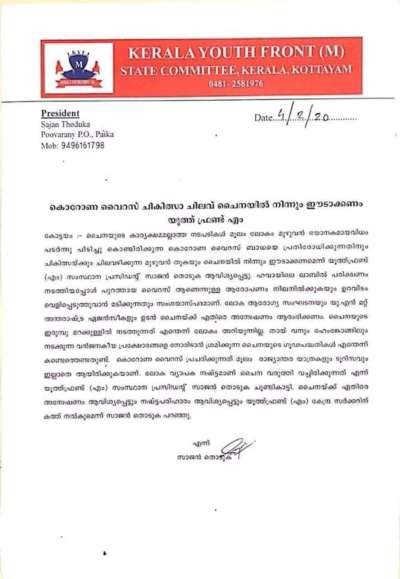കോട്ടയം: ലോകമെമ്ബാടും ഭീതി പടര്ത്തുന്ന കൊറോണ വൈറസ് കേരളത്തിലും സ്ഥിരീകരിച്ചതിന് പിന്നാലെ ഉത്ഭവ കേന്ദ്രമായ ചൈനയ്ക്ക് എതിരെ പത്രകുറിപ്പുമായി കേരളാ യൂത്ത് ഫ്രണ്ട് (എം). കൊറോണ വൈറസ് സംസ്ഥാന ദുരന്തമായി കേരളം പ്രഖ്യാപിച്ചതിന് പിന്നാലെ ചികിത്സാ ചിലവ് ചൈനയില് നിന്ന് ഈടാക്കണമെന്നാണ് കേരളാ യൂത്ത് ഫ്രണ്ട് (എം) സംസ്ഥാന പ്രസിഡന്റ് സാജന് തൊടുക ആവശ്യപ്പെട്ടിരിക്കകയാണ്.