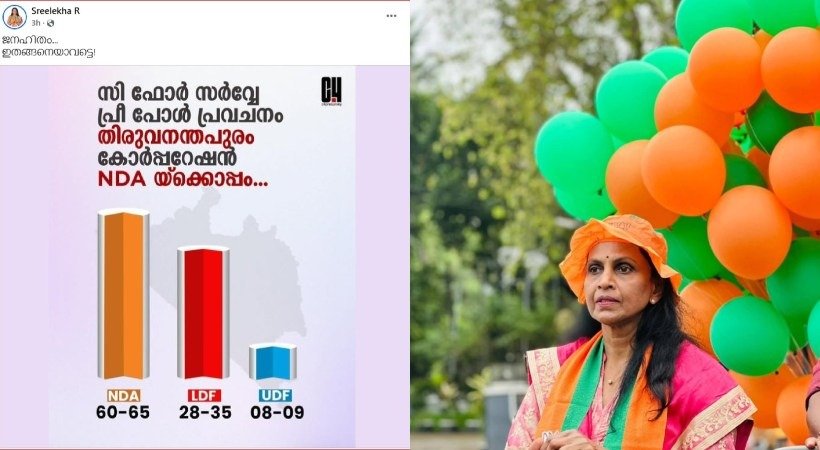 വോട്ടെടുപ്പ് ദിനത്തില് തിരഞ്ഞെടുപ്പ് ചട്ട വിരുദ്ധ നടപടിയുമായി തിരുവനന്തപുരം കോര്പറേഷനിലെ എന്ഡിഎ സ്ഥാനാര്ത്ഥി ആര് ശ്രീലേഖ. തിരഞ്ഞെടുപ്പ് സര്വേ ഫലം ഫേസ്ബുക്കില് പോസ്റ്റ് ചെയ്തു. ജനഹിതം.. ഇതങ്ങനെയാവട്ടെ എന്ന് വ്യക്തമാക്കിക്കൊണ്ടാണ് സീഫോര് സര്വേ പ്രീ പോള് പ്രവചനം ; തിരുവനന്തപുരം കോര്പറേഷന് എന്ഡിഎയക്ക് ഒപ്പം എന്നുള്ള സര്വേ ഫലം പങ്കുവച്ചത്. ചില ബിജെപി നേതാക്കളും ഇതേ ഫലം പോസ്റ്റ് ചെയ്തിട്ടുണ്ട്. വിവാദമായതോടെ പോസ്റ്റ് പിന്വലിച്ചു.