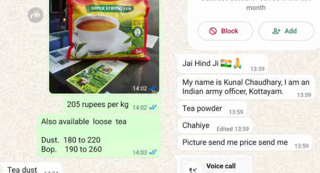 ഇറക്കുമതി ചെയ്യേണ്ട തേയിലയുടെ അളവിനെ കുറിച്ചും ഗുണമേന്മയെ കുറിച്ചും വാട്സ്ആപ്പിലൂടെ സംസാരിക്കുകയും ചെയ്തു. കരാറിനായി അയച്ചുതന്ന ലിങ്ക് വഴി പണമടക്കണമെന്ന് നിര്ബന്ധിച്ചതോടെ സംശയം തോന്നി നടത്തിയ പരിശോധനയിലാണ് തട്ടിപ്പാണെന്ന് ബോധ്യമായത്. തുടർന്ന് അമീൻ കോട്ടയം സൈബർ പൊലീസിൽ പരാതി നൽകുകയും ചെയ്തു.