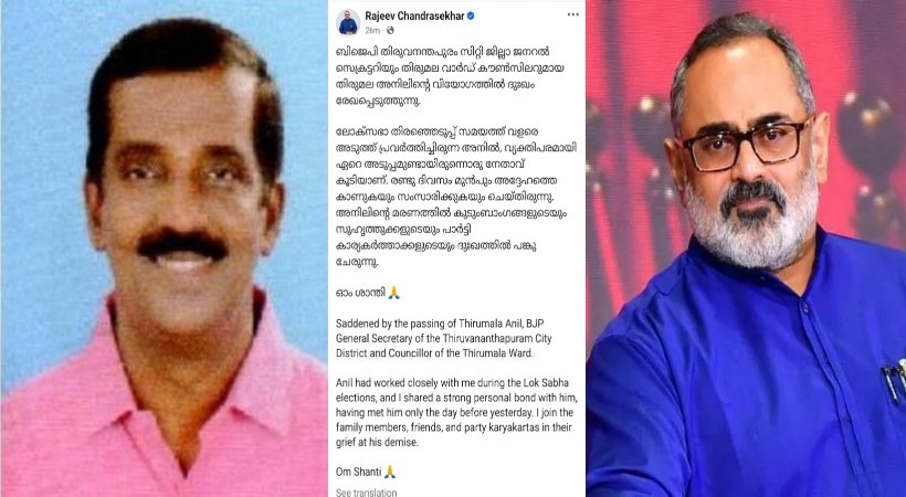 തിരുമല ബിജെപി കൗൺസിലർ അനിൽ സഹായം അഭ്യർത്ഥിച്ച് സംസ്ഥാന അധ്യക്ഷൻ രാജീവ് ചന്ദ്രശേഖറിനെ കണ്ടിരുന്നു. തന്നെ അനിൽ നേരിൽ കണ്ട് സംസാരിച്ചെന്ന് സ്ഥിരീകരിച്ച് രാജീവ് ചന്ദ്രശേഖറിന്റെ അനുശോചന കുറിപ്പ്.