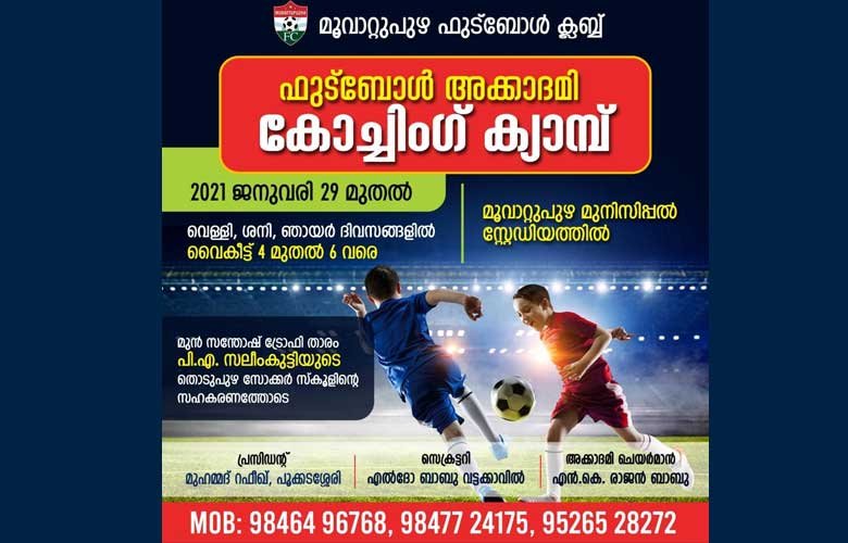 മുവാറ്റുപുഴ ഫുട്ബോള് ക്ലബ്ബ് അക്കാദമി കോച്ചിങ് ക്യാമ്പ് പുനരാരംഭിക്കുന്നു. 2021 ജനുവരി 29 മുതല് വൈകിട്ട് 4 മുതല് 6 വരെയാണ് ക്യാമ്പ്. മുവാറ്റുപുഴ മുനിസിപ്പല് സ്റ്റേഡിയത്തില് എല്ലാ ആഴ്ച്ചയിലും വെള്ളി, ശനി, ഞായര് ദിവസങ്ങളില് ആണ് ക്യാമ്പ് നടക്കുന്നത്. സമയം വൈകിട്ട് 4 മുതല് 6 വരെ.