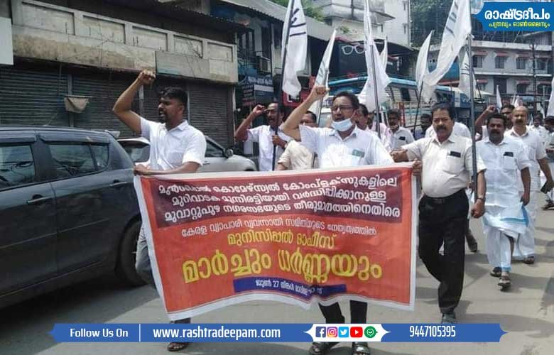 മുവാറ്റുപുഴ: മുവാറ്റുപുഴ നഗരസഭയിലെ മുന്സിപ്പല് ഷോപ്പിംഗ് കോംപ്ക്സുകളുടെ വാടക മൂന്നും നാലും ഇരട്ടിയാക്കി വര്ദ്ധിപ്പിക്കാനുള്ള നഗരസഭ ഭരണാധികാരികളുടെ ഏകപക്ഷീയമായ തീരുമാനത്തിന് എതിരെ കേരള വ്യാപാരി വ്യവസായി സമിതിയുടെ നേതൃത്വത്തില് മുന്സിപ്പല് കോംപ്ളക്സുകളിലെ കച്ചവടക്കാര് നഗരസഭാ കാര്യാലയത്തിലേക്ക് മാര്ച്ച് നടത്തി.