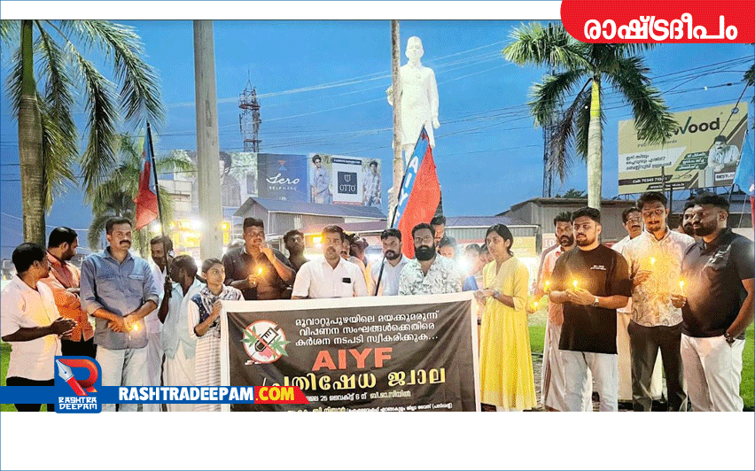 മൂവാറ്റുപുഴ നെഹ്റു പാര്ക്കില് നെഹ്റു പ്രതിമയ്ക്ക് മുന്നില് നടന്ന പ്രതിഷേധ ജ്വാല എഐവൈഎഫ് ജില്ലാ വൈസ് പ്രസിഡണ്ട് കെ ബി നിസാര് ഉദ്ഘാടനം ചെയ്തു . മണ്ഡലം പ്രസിഡന്റ് സൈജല് പാലിയത്ത് അദ്ധ്യക്ഷത വഹിച്ചു. എഐഎസ്എഫ് ജില്ലാ സെക്രട്ടറി ഗോവിന്ദ് എസ് കുന്നുംപുറത്ത്, എ ഐ വൈ എഫ് മണ്ഡലം സെക്രട്ടറി അഡ്വ. എല് എ. അജിത്ത്,സിപിഐ ലോക്കല് സെക്രട്ടറി കെ പി അലികുഞ്ഞ്, യുവകലാസാഹിതി സംസ്ഥാന കമ്മിറ്റി അംഗം ജോര്ജ് വെട്ടിക്കുഴി , അന്ഷാദ് തേനാലി , ജിനീഷ് ഗംഗാദരന് , സി എന് ഷാനവാസ്, അബിന് മാത്യു, സക്ലൈന് മജീദ് തുടങ്ങിയവര് സംസാരിച്ചു