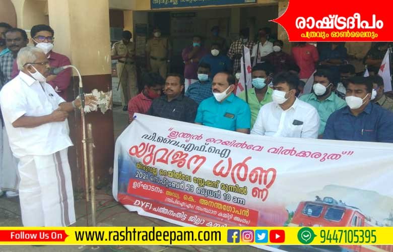 തിരുവല്ല: ‘ഇന്ത്യന് റെയില്വേ വില്ക്കരുത്’ എന്ന മുദ്രാവാക്യം ഉയര്ത്തി തിരുവല്ല റെയില്വേ സ്റ്റേഷനു മുന്നില് ധര്ണ നടത്തി. ഡിവൈഎഫ്ഐ ജില്ലാ കമ്മറ്റിയുടെ നേതൃത്വത്തിലാണ് ര്ണ നടത്തിയത്. സിപിഐഎം സംസ്ഥാന കമ്മറ്റി അംഗം അഡ്വ. കെ അനന്തഗോപന് ധര്ണ ഉദ്ഘാടനം ചെയ്തു.