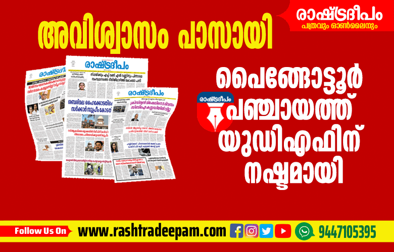 കോതമംഗലം: പൈങ്ങോട്ടൂര് പഞ്ചായത്ത് പ്രസിഡന്റ് സിസി ജെയ്സണെതിരെ എല്ഡിഎഫ് നേതൃത്വത്തില് കൊണ്ടു വന്ന അവിശ്വാസം പാസായി. അവിശ്വാസ നോട്ടീസ് നല്കിയതിന് തൊട്ടുപിന്നാലെ രാജിവച്ച വൈസ് പ്രസിഡന്റ് അവിശ്വാസ പ്രമേയ ചര്ച്ചയില് നിസാര് മുഹമ്മദ് എല്ഡിഎഫിന് അനുകൂലമായി വോട്ട് രേഖപ്പെടുത്തി. ഇതോടെ പഞ്ചായത്ത് ഭരണം പൂര്ണ്ണമായി യുഡിഎഫിന് നഷ്ടമായി.