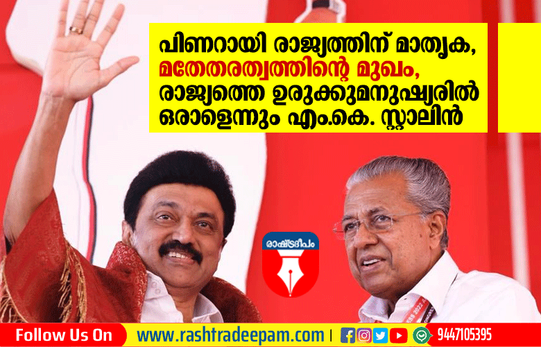 ഒരു കയ്യില് പോരാട്ട വീര്യവും മറുകയ്യില് ഭരണ പാടവുമുള്ള മുഖ്യമന്ത്രിയാണ് പിണറായി വിജയനെന്ന് തമിഴ്നാട് മുഖ്യമന്ത്രി എം,കെ. സ്റ്റാലിന്. ഭരണമികവില് പിണറായി തനിക്ക് എന്നും വഴി കാട്ടിയാണ്. രാജ്യത്തിന് മാതൃകയായ വികസന , ക്ഷേമ പധതികളാണ് അദ്ദേഹത്തിന്റെ നേതൃത്വത്തില് നടപ്പാക്കുന്നത്. പിണറായി രാജ്യത്തെ ഉരുക്കുമനുഷ്യരില് ഒരാളാണ്. പൊതു പ്രവര്ത്തകരില് വേറിട്ട മുഖം. രാജ്യത്തെ അവകാശ പോരാട്ടങ്ങളുടെയും മതേതരത്വത്തിന്റേയും മുഖമാണ് പിണറായി വിജയന്.