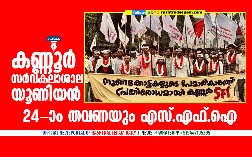 കണ്ണൂര്: കണ്ണൂര് യൂണിവേഴ്സിറ്റി യൂണിയന് തുടര്ച്ചയായ 24 ആം തവണയും എസ്എഫ്ഐയ്ക്ക്. മുഴുവന് സീറ്റിലും എസ്എഫ്ഐ സ്ഥാനാര്ഥികള് വിജയിച്ചു. 120 കൗണ്സിലര്മാരില് പോള് ചെയ്ത 108ല് 70 വോട്ടും എസ്എഫ്ഐ നേടി.