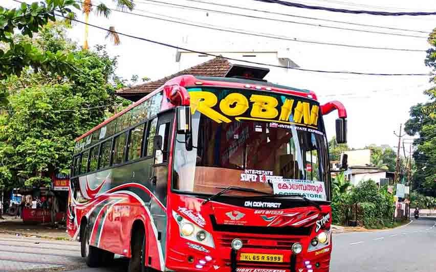 എന്നാല് ഇന്നു രാവിലെ ബസ് റാന്നിയില് എത്തിയപ്പോള് മോട്ടര് വാഹന വകുപ്പ് ഉദ്യോഗസ്ഥര് ബസ് തടഞ്ഞു പരിശോധിച്ചെങ്കിലും പെര്മിറ്റ് സംബന്ധമായ പ്രശ്നങ്ങളൊന്നും കണ്ടെത്താനായില്ല. വിന്ഡ് ഷീല്ഡ് പൊട്ടി, എയര് ലീക്കേജ്, ടയറിനു തേയ്മാനം, വയറിങ് പ്രശ്നം തുടങ്ങിയ പ്രശ്നങ്ങള് ചൂണ്ടിക്കാട്ടി നോട്ടീസ് നല്കി. സെപ്റ്റംബര് 15ന് മുന്പു ഇവ പരിഹരിച്ചു ആര്ടിഒയ്ക്കു മുന്നില് പരിശോധനയ്ക്ക് ഹാജരാക്കാണമെന്നാണ് ആവശ്യപ്പെട്ടിരിക്കുന്നത്. എന്നാല് സര്വീസ് നിയമാനുസൃതമാണെന്ന് ബസുടമ പറഞ്ഞു. ഓള് ഇന്ത്യ ടൂറിസ്റ്റ് പെര്മിറ്റുള്ള ബസ് കേരളത്തില് നിന്നുള്ള ബെംഗളൂരു, ചെന്നൈ സര്വീസ് മാതൃകയിലാണ് ഓപ്പറേറ്റ് ചെയ്യുന്നതെന്നും സര്വീസ് നിയമപരമാണെന്നും ഇന്റര്സ്റ്റേറ്റ് ബസ് ഓപ്പറേറ്റേഴ്സ് അസോസിയേഷന് സംസ്ഥാന സെക്രട്ടറി എ.ജെ. റിജാസ് പറഞ്ഞു. നിയമത്തില് ബോര്ഡ് വയ്ക്കാന് പാടില്ലെന്ന് എവിടെയും പറയുന്നില്ല. ഒരോ മൂന്നു മാസം കൂടുമ്പോഴും 3 ലക്ഷം രൂപയോളം സര്ക്കാരിനു നികുതി ഇനത്തില് അടയ്ക്കുന്ന ഇന്റര് സ്റ്റേറ്റ് ബസുകളെ പ്രോല്സാഹിപ്പിക്കുകയാണു വേണ്ടതെന്നും സംഘടന ആവശ്യപ്പെടുന്നു. ഇതില് 2 ലക്ഷം രൂപയോളം സംസ്ഥാന സര്ക്കാരിനും ബാക്കി കേന്ദ്രസര്ക്കാരിലേക്കുമാണു പോകുന്നത്. റോബിന് മോട്ടോഴ്സാണു പത്തനംതിട്ട-കോയമ്പത്തൂര് സര്വീസ് ആരംഭിച്ചിരിക്കുന്നത്.