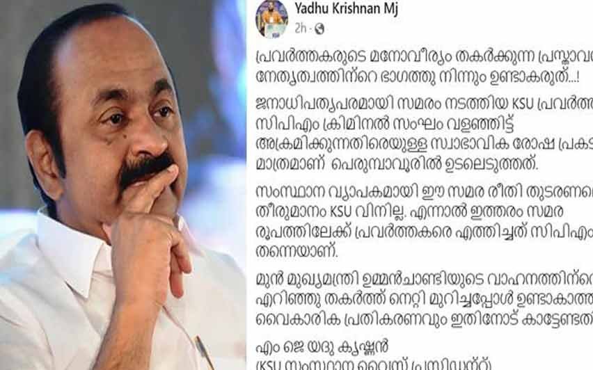 ജനാധിപത്യപരമായി സമരം നടത്തിയ കെഎസ്യു പ്രവര്ത്തകരെ സിപിഎം ക്രിമിനല് സംഘം വളഞ്ഞിട്ട് ആക്രമിക്കുന്നതിനെതിരെയുള്ള സ്വാഭാവികമായ രോഷപ്രകടനം മാത്രമാണ് പെരുമ്ബാവൂരില് ഉണ്ടായത്. സംസ്ഥാന വ്യാപകമായി ഈ സമരരീതി തുടരണമെന്ന തീരുമാനം കെഎസ്യുവിനില്ലെന്നും പോസ്റ്റില് പറയുന്നു.