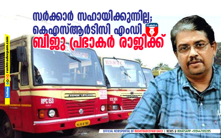തിരുവനന്തപുരം: കെ.എസ്.ആര്.ടി.സിയില് ശമ്പള പ്രതിസന്ധി രൂക്ഷമായതിനു പിന്നാലെ രാജിക്കൊരുങ്ങി കെഎസ്ആര്ടിസി സി.എം.ഡി. ബിജു പ്രഭാകര്. രാജി സന്നദ്ധത സര്ക്കാരിനെ അറിയിച്ചിട്ടുണ്ടെന്നും ബിജു പ്രഭാകര് വ്യക്തമാക്കി. ശമ്പളം നല്കുന്നതിന് പോലും സര്ക്കാര് സഹായിക്കുന്നില്ലെന്നും കെ.എസ്.ആര്.ടി.സിയുടെ പ്രതിസന്ധിയേക്കുറിച്ച് ഫെയ്സ്ബുക്കിലൂടെ വെളിപ്പെടുത്തുമെന്നും ബിജു പ്രഭാകര് പറഞ്ഞു.