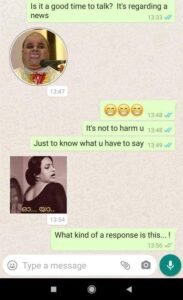 ഒരു വാര്ത്തയുടെ ആവശ്യത്തിന് വേണ്ടിയാണ് താന് ബന്ധപ്പെടാന് ശ്രമിക്കുന്നതെന്നും ഇപ്പോള് സംസാരിക്കാന് സാധിക്കുമോ എന്നുമുള്ള മാധ്യമ പ്രവര്ത്തകയുടെ ചോദ്യത്തിന് സിനിമാ നടന് സുനില് സുഖദയുടെ ചിത്രമായിരുന്നു പ്രശാന്തിന്റെ മറുപടി. തുടര്ന്ന് താങ്കളെ ഉപദ്രവിക്കാന് ഉദ്ദേശിച്ചിട്ടില്ലെന്നും പ്രതികരണമറിയാന് വേണ്ടി മാത്രമാണെന്നും മാധ്യമ പ്രവര്ത്തക വിശദീകരിക്കുന്നുണ്ട്. ഇതിന് ലൈംഗിക ചുവയോടുകൂടിയ ചിത്രവും പരിഹാസവുമായിരുന്നു പ്രശാന്ത് തിരിച്ചയച്ചത്.