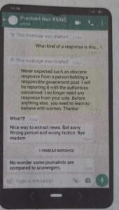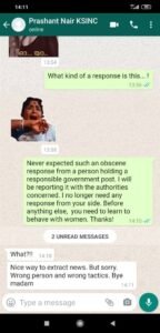 ഇതില് പ്രകോപിതയായ മാധ്യമപ്രവര്ത്തക എന്തുതരത്തിലുള്ള മറുപടിയാണിത് എന്ന് ചോദിച്ചപ്പോള് മറ്റൊരു നടിയുടെ ചിത്രം പ്രശാന്ത് അയച്ചു. ഇത്തരം തരംതാഴ്ന്ന പ്രതികരണം ഉത്തരവാദിത്തപ്പെട്ട സര്ക്കാര് ഉദ്യോഗസ്ഥനില് നിന്നും പ്രതീക്ഷിച്ചില്ലെന്നും ഇക്കാര്യത്തെക്കുറിച്ച് അധികാരികളോട് പരാതിപ്പെടുമെന്നും പ്രവിത പ്രശാന്തിനോട് പറഞ്ഞു. ഇനി പ്രതികരണം ആവശ്യമില്ലെന്നും സ്ത്രീകളോട് പെരുമാറേണ്ടത് എങ്ങനെയാണെന്നാണ് താങ്കള് ആദ്യം പഠിക്കേണ്ടതെന്നും പ്രവിത പറയുന്നു. ഇതിനോട്, വാര്ത്ത ചോര്ത്തിയെടുക്കുന്ന രീതി കൊള്ളാം എന്നായിരുന്നു പ്രശാന്തിന്റെ മറുപടി. മാധ്യമപ്രവര്ത്തകരെ തോട്ടിപ്പണിയെടുക്കുന്നവരുമായി താരതമ്യം ചെയ്യുന്നതില് അത്ഭുതപ്പെടാനുമില്ലെന്നും പ്രശാന്ത് പറയുന്നു.