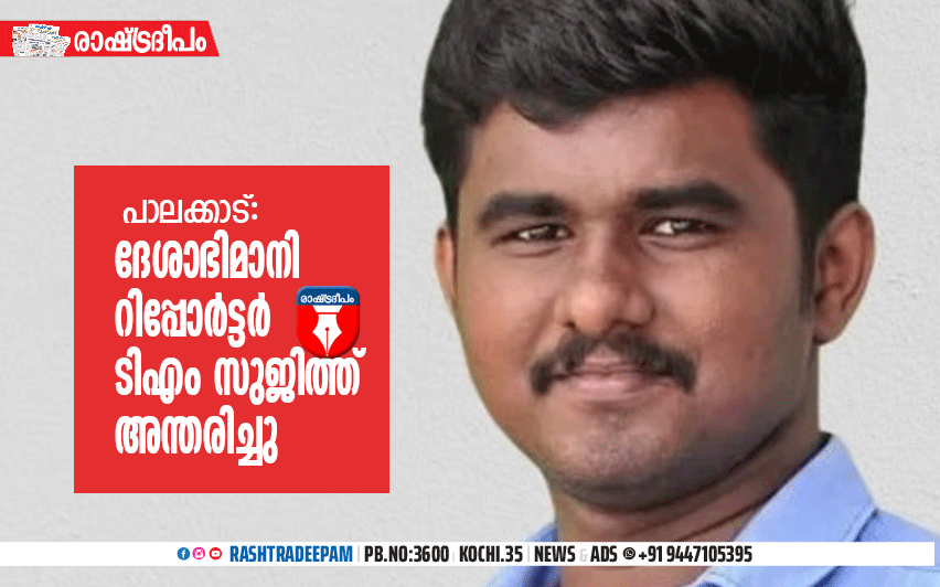 പാലക്കാട്: ദേശാഭിമാനി ദിനപത്രം റിപ്പോര്ട്ടര് ടി എം സുജിത് അന്തരിച്ചു. ദേശാഭിമാനി പാലക്കാട് ബ്യൂറോ റിപ്പോര്ട്ടറാണ് ടി എം സുജിത്. കുറച്ച് നാളുകളായി തൃശൂര് ജൂബിലി മിഷന് മെഡിക്കല് കോളജില് സുജിത്ത് ചികിത്സയിലായിരുന്നു.