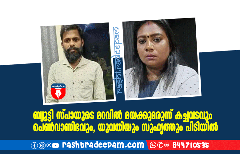 തൃശൂര്: ബ്യൂട്ടി സ്പായുടെ മറവില് മയക്കുമരുന്ന് കച്ചവടവും പെണ്വാണിഭവും നടത്തിയ കേസില് യുവതിയെയും സഹായിയായ സുഹൃത്തിനെയും തൃശൂരില് എക്സൈസ് സംഘം അറസ്റ്റ് ചെയ്തു. മൈലിപാടം സ്വദേശി ഹസീന (35) പട്ടാമ്പി സ്വദേശി അഭിലാഷ് എന്നിവരാണ് പിടിയിലായത്. തൃശൂര് എക്സൈസ് റേഞ്ച് ഓഫീസിലെ ഇന്സ്പെക്ടര് അബ്ദുള് അഷ്റഫും സംഘവും നടത്തിയ പരിശോധനയിലാണ് തൃശൂര് ശങ്കരയ്യ റോഡിലുള്ള ഡ്രീംസ് യൂണിസെക്സ് ബ്യൂട്ടി സലൂണ് ബോഡി സ്പായില് നിന്ന് മയക്കുമരുന്നുകള് പിടിച്ചെടുത്തത്. മയക്കുമരുന്ന് പൊതിയാന് ഉപയോഗിക്കുന്ന പ്ലാസ്റ്റിക് പാക്കറ്റുകളും എംഡിഎംഎ പാക്ക് ചെയ്യുന്ന ചെറിയ പ്ലാസ്റ്റിക് കവറുകളും റെയ്ഡില് കണ്ടെടുത്തിട്ടുണ്ട്