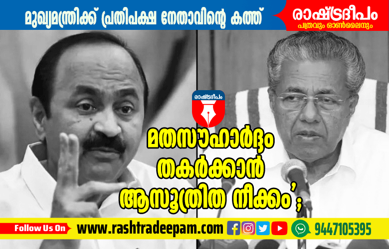 കേരളത്തിന്റെ മതസൗഹാര്ദവും സാമൂഹിക ഇഴയടുപ്പവും തകര്ക്കുവാന് ലക്ഷ്യമിട്ട് സമൂഹമാധ്യമങ്ങളില് നടക്കുന്ന ആസൂത്രിത നീക്കങ്ങള്ക്കെതിരെ നടപടി ആവശ്യപ്പെട്ട് മുഖ്യമന്ത്രി പിണറായി വിജയന് പ്രതിപക്ഷ നേതാവ് വിഡി സതീശന് കത്ത് നല്കി. മതവിശ്വാസികള്ക്കിടയില് ചേരിതിരിവും സ്പര്ധയും സൃഷ്ടിക്കാനുള്ള ബോധപൂര്വ്വമുള്ള ശ്രമമാണ് നടക്കുന്നത്. വര്ഗീയ വിഷം ചീറ്റുന്ന ഇവരില് പലരും ഫേക്ക് ഐ.ഡികളിലൂടെ ആസൂത്രിതമായി കേരളത്തിന്റെ മത മൈത്രി തകര്ക്കാന് കച്ചകെട്ടി ഇറങ്ങിയവരാണെന്ന് സംശയിക്കേണ്ടിയിരിക്കുന്നു. ഇവര്ക്കെതിരെ കര്ശനനടപടി സ്വീകരിക്കണമെന്നും സതീശന് ആവശ്യപ്പെട്ടു.