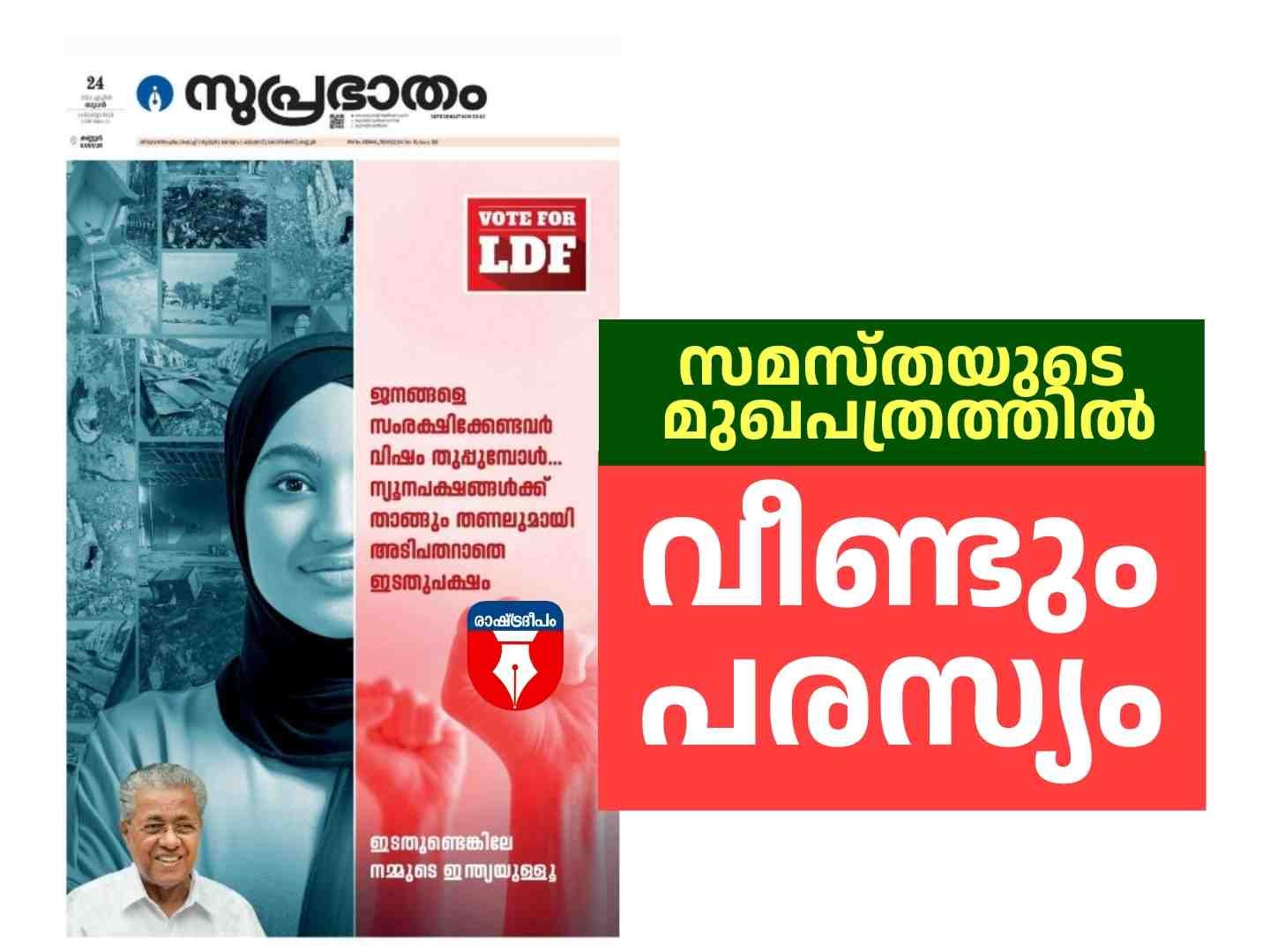 കോഴിക്കോട്: സമസ്ത മുഖപത്രമായ സുപ്രഭാതത്തിൽ ഇന്നും ഇടത് മുന്നണിയുടെ പരസ്യം. സുപ്രഭാതം ദിനപത്രത്തിൻ്റെ ആദ്യപേജ് ന്യൂനപക്ഷങ്ങൾക്ക് താങ്ങും തണലുമായി അടിപതറാതെ ഇടതുപക്ഷമെന്ന സന്ദേശത്തോടെയുള്ള പരസ്യമാണ് പ്രസിദ്ധീകരിച്ചിരിക്കുന്നത്. ജനങ്ങളെ സംരക്ഷിക്കേണ്ടവര് വിഷം തുപ്പുമ്പോള് ന്യൂനപക്ഷങ്ങള്ക്ക് താങ്ങും തണലുമായി അടിപതറാതെ ഇടതുപക്ഷം എന്ന നിർണ്ണായകമായ രാഷ്ട്രീയ സന്ദേശത്തോടെയുള്ള പരസ്യത്തിൽ മുഖ്യമന്ത്രി പിണറായി വിജയൻ്റെ ചിത്രവുമുണ്ട്. നേരത്തെ സമസ്ത മുഖപത്രത്തിൽ ഇടത് മുന്നണി പരസ്യം പ്രസിദ്ധീകരിച്ചതിൽ പ്രതിഷേധിച്ച് ലീഗ് പ്രവർത്തകൻ സുപ്രഭാതം കത്തിച്ചുവെന്ന ആരോപണം വിവാദമായിരുന്നു. ഇതിനുപിന്നാലെയാണ് ഇന്ന് വീണ്ടും പത്രം പരസ്യം പ്രസിദ്ധീകരിച്ചത് പത്രം പരസ്യം പ്രസിദ്ധീകരിച്ചത്