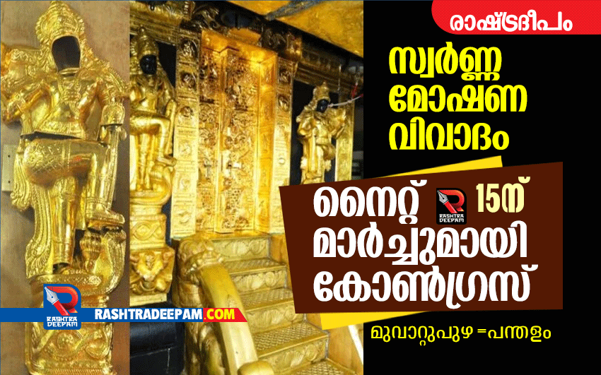 മുവാറ്റുപുഴ : ശബരിമല സ്വര്ണ്ണ മോഷണ വിവാദത്തില് നൈറ്റ് മാര്ച്ചുമായി കോണ്ഗ്രസ്. ദേവസ്വം വകുപ്പ് മന്ത്രി വി.എന് വാസവനും ദേവസ്വം ബോര്ഡ് പ്രസിഡന്റ് പി എസ് പ്രശാന്തും രാജിവെക്കണമെന്നവശ്യപ്പെട്ടാണ് ബ്ലോക്ക് കോണ്ഗ്രസ് കമ്മിറ്റികളുടെ നേതൃത്വത്തില് നൈറ്റ് മാര്ച്ച് സംഘടിപ്പിക്കുന്നത്.