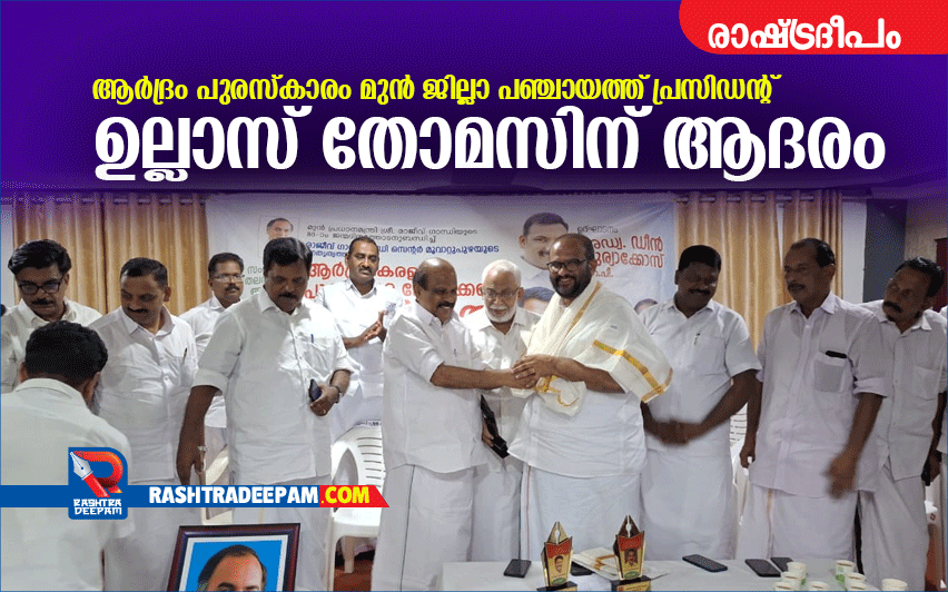 സംസ്ഥാന സര്ക്കാരിന്റെ ആര്ദ്രം പുരസ്കാരത്തിന് ജില്ലാ പഞ്ചായത്തിലെ പ്രാപ്തമാക്കിയ 2022-23 വര്ഷത്തെ ജില്ലാ പഞ്ചായത്ത് പ്രസിഡന്റ് ഉല്ലാസ് തോമസ്, നിലവിലെ പ്രസിഡന്റ് മനോജ് മൂത്തേടന്, സംസ്ഥാനതലത്തില് നഗരസഭ വിഭാഗത്തില് മൂന്നാം സ്ഥാനത്തിന് മൂവാറ്റുപുഴ നഗരസഭയെ സജ്ജമാക്കിയ ചെയര്മാന് പി പി എല്ദോസ് എന്നിവരെ ചടങ്ങില് മാത്യുകുഴല്നാടന് എംഎല്എ കെപിസിസി ജനറല് സെക്രട്ടറിമാരായ കെ.പി ധനപാലന്, ജയ്സണ് ജോസഫ് എന്നിവര് ആദരിച്ചു.