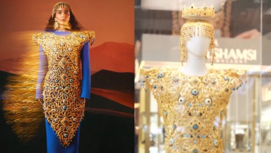 കൈയിൽ നീണ്ടുനിൽക്കുന്ന സ്വർണ ബ്രേസ്ലെറ്റ്, കിരീടം തുടങ്ങിയവ നിർമാണത്തിലെ കലാവൈഭവം പ്രകടമാക്കുന്നതാണ്. ഷാർജയിൽ നടന്ന 56-ാമത് മിഡിൽ ഈസ്റ്റ് വാച്ച് ആൻഡ് ജ്വല്ലറി ഷോയിലാണ് വസ്ത്രം ആദ്യമായി അവതരിപ്പിച്ചത്. ലോകമെമ്പാടുമുള്ള 1800-ഓളം ഡിസൈനർമാരും കരകൗശല വിദഗ്ധരും പങ്കെടുക്കുന്ന ഷോയിൽ 500 ലധികം പ്രാദേശിക, അന്തർദേശീയ പ്രദർശകരാണ് പങ്കെടുക്കുന്നത്.